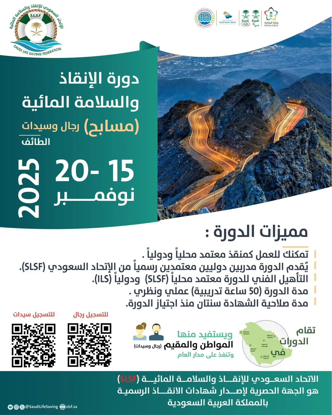 دورة الإنقاذ والسلامة المائية + أضف إلى تقويم Google + تصدير iCal / Outlook التاريخ نوفمبر 15 - 20 2025 انتهت! التوقيت طوال اليوم الموقع الطائف الفئة الدورات شارك هذا الحدث